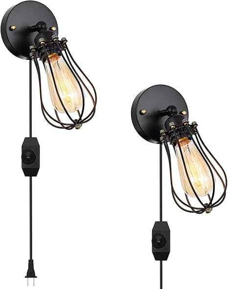 Wire Cage Wall Sconces Edison E26 Base With Dimmer Switch Vintage Style Wall Light With Cord Plug In Wall Lamp For Headboard Porch Garage Bedroom Of 2
